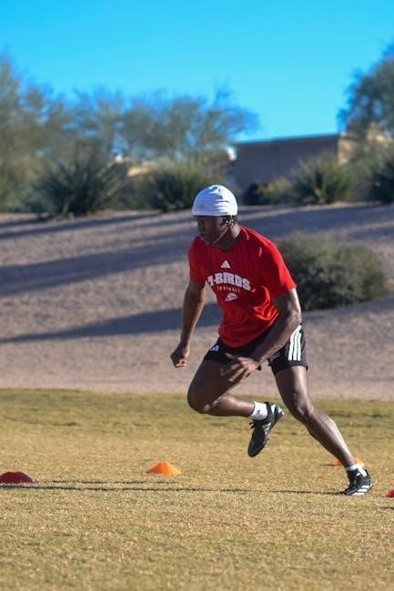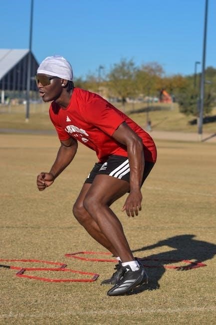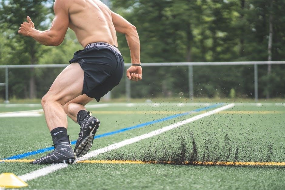 Agility drills, like cone drills and shuttle runs, enhance quickness and change-of-direction ability. Interval training, featuring high-intensity bursts followed by recovery periods, is also central. PDF resources outline specific distances, times, and rest intervals, ensuring a progressive and challenging conditioning regimen.